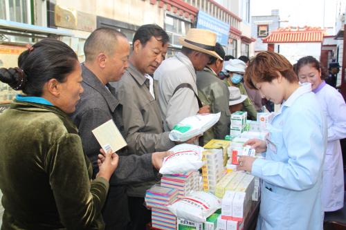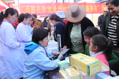根據(jù)自治區(qū)工商聯(lián)《關(guān)于深化區(qū)直機(jī)關(guān)在職黨員到社區(qū)服務(wù)群眾活動(dòng)》的統(tǒng)一安排:阜康醫(yī)藥有限公司四個(gè)黨支部,在張德才總院長(zhǎng)的帶領(lǐng)下,一行8人在2015年8月8日上午到拉薩市城關(guān)區(qū)嘎瑪貢桑社區(qū)進(jìn)行義診活動(dòng),帶著1.5萬(wàn)余元藥品和便攜式B超,心電圖等。在半天時(shí)間內(nèi)貢義診380余人,為社區(qū)群眾進(jìn)行了測(cè)量血壓、發(fā)放藥品、健康咨詢等,受到了社區(qū)群眾的熱烈歡迎。期間正在慰問(wèn)群眾的自治區(qū)政協(xié)副主席阿沛晉源,和區(qū)統(tǒng)戰(zhàn)部副部長(zhǎng)、區(qū)工商聯(lián)黨組副書(shū)記李瑞富等領(lǐng)導(dǎo)的高度評(píng)價(jià)。