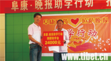 2008年8月29日下午,“阜康獎(jiǎng)學(xué)金.晚報(bào)助學(xué)行動(dòng)”活動(dòng)組委會(huì)在西藏阜康醫(yī)院會(huì)議室舉行捐助儀式,西藏16名品學(xué)兼優(yōu)的貧困學(xué)生獲得了每人每年6000元的捐助,解決了他們大學(xué)四年的生活費(fèi),至此,為期兩個(gè)多月的“阜康·晚報(bào)助學(xué)行動(dòng)”愛心捐助活動(dòng)畫上了圓滿的句號(hào)。
