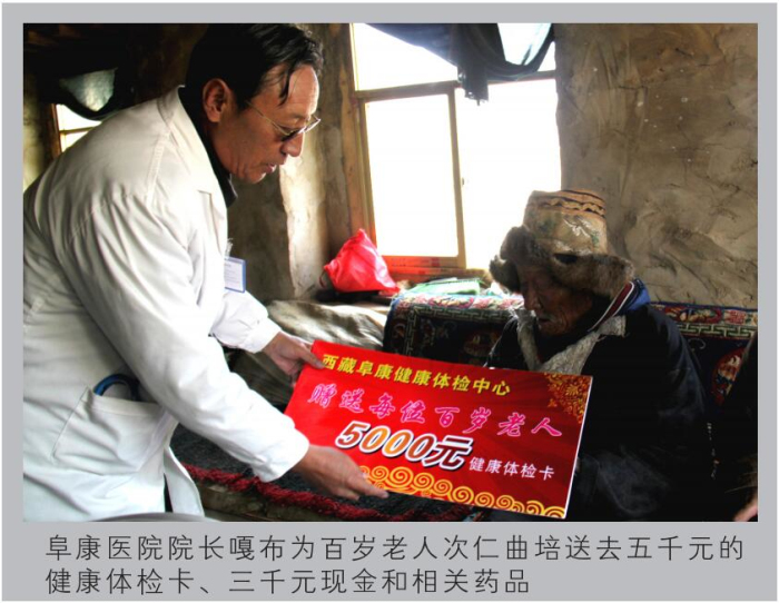 西藏高寒缺氧,自然環(huán)境惡劣。60多年前,這里的人均壽命才35.5歲。然而到了2012年,光拉薩的七縣一區(qū)就有16位百歲老人,正是這些百歲老人,見證了西藏翻天覆地的巨變,他們是全社會的寶貴財富,更是西藏從貧窮落后走向繁榮富強的親歷者、見證者。在全國人民喜迎黨的十八大勝利召開之際,西藏阜康(國際)健康體檢中心與拉薩市民政局老齡辦組織發(fā)起了“關(guān)愛百歲老人行動”。此次行動歷時16天,里程2000多公里,尋訪了拉薩七縣一區(qū)十一位百歲老人,不僅為每位老人送上了精心準(zhǔn)備的三千元現(xiàn)金、五千元健康體檢卡、一個便攜式氧氣瓶、一個便攜式血壓儀,還為他們送上了免費義診和相關(guān)藥品。王斌董事長參加了此項活動的啟動儀式,嘎布院長、張德才院長親自帶隊為每一位百歲老人做了常規(guī)的身體檢查,并送上了藥品和祝福。