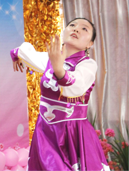 丹丹告訴筆者,之所以會(huì)選擇“鴻雁”這支舞蹈,是因?yàn)橄矚g上了“鴻雁”那首歌,歌聲悠揚(yáng)婉轉(zhuǎn),仿佛把她帶到了大草原,看到了美麗的牧羊姑娘,看到了悠閑的馬兒,看到了像白蓮花般盛開的氈包……因?yàn)檎也坏胶线m的舞伴,丹丹只好把這支集體舞改成了獨(dú)舞,練習(xí)中她不是純粹的模仿,也會(huì)適當(dāng)?shù)馗木?。練?xí)鴻雁時(shí)自己傷佛也變成了一只北歸的大雁,那是一種很奇妙的感覺。能夠在此次演出中獲得大家的認(rèn)可更是堅(jiān)定了她練習(xí)舞蹈的決心,丹丹表示會(huì)繼續(xù)練習(xí)舞蹈,爭(zhēng)取在下一次的演出中帶給大家更美的視覺盛宴。