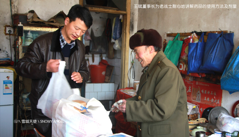 老同志開了一個小小的雜貨鋪,主要經(jīng)營一些食用油、罐頭之類食品。原本不大的店面加之已是很陳1舊的招牌,使得這間雜貨鋪更為不顯眼。羅老同志見王斌先生來看望他,很是高興,就像是見到親人一般的激動。王斌先生對老同志噓寒問暖,親切地詢問著他的病情,耐心地為他一一講解著這些藥品的使用方法及劑量,一遍一遍地叮囑著要他堅(jiān)持把有軟化血管作用的補(bǔ)品吃上。當(dāng)王斌先生準(zhǔn)備起身離開時,老人家再次緊緊握住了他的手,感激地說道:“ 謝謝你們還記得我,我打心眼里感謝你們!”