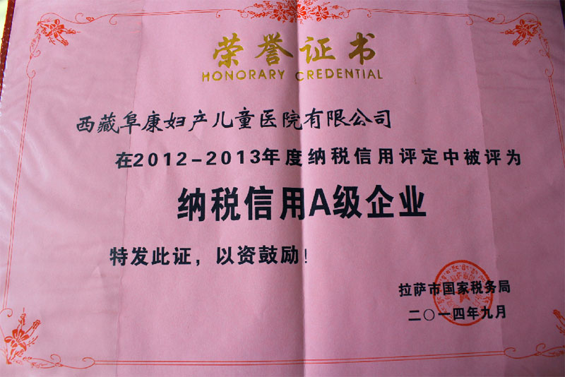 2014年10月17日,拉薩市國(guó)稅局召開“拉薩市2012-2013年度納稅信用等級(jí)A級(jí)納企業(yè)”榮譽(yù)表彰大會(huì)。西藏阜康兒童醫(yī)院有限公司被評(píng)為“納稅信用A級(jí)企業(yè)”。