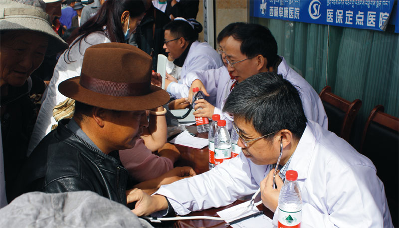 2014年9月29日,8位來自內(nèi)地各大醫(yī)院的專家在娘熱路阜康醫(yī)院門口為市民義診。阜康醫(yī)院業(yè)務(wù)副院長張治說:“原本有14位專家來參加義診,可是因為幾位有高原反應(yīng),最后只有這8位老師來到現(xiàn)場。”