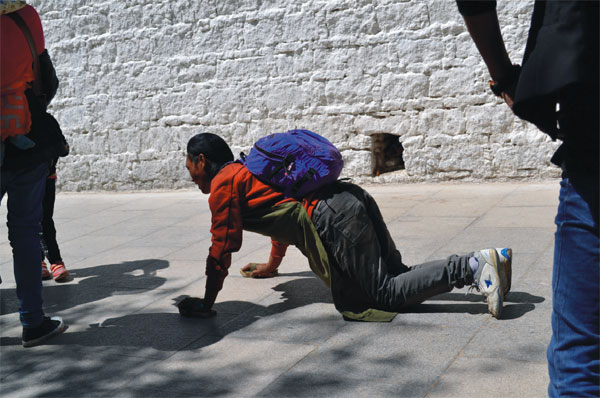 對(duì)于磕長(zhǎng)頭,很容易讓人想起倉(cāng)央嘉措的詩(shī):那一天,閉目在經(jīng)殿香霧中,驀然聽見,你誦經(jīng)中的真言;那一月,我搖動(dòng)所有轉(zhuǎn)經(jīng)筒,不為超度,只為觸摸你的指尖;那一年,磕長(zhǎng)頭匍匐在山路,不為覲見,只為貼著你的溫暖;那一世,轉(zhuǎn)山轉(zhuǎn)水轉(zhuǎn)佛塔,不為修來生,只為途中與你相見。