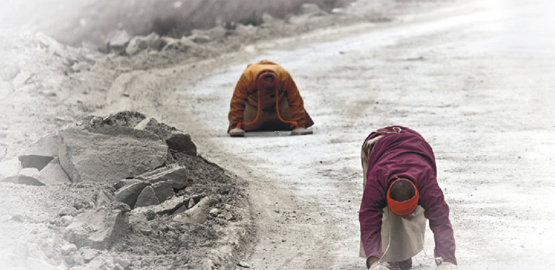 這是快樂美好的七個月,這七個月我們度過了拉薩舒適的夏季、絢麗的秋天、干燥而陽光燦爛的冬季,領略了雪域高原的大美風光和藏區(qū)神圣的宗教人文景觀。五彩的經(jīng)幡在湛藍的天空下飄揚、清澈見底的高山湖泊在明媚的陽光下泛著七彩的波光,高聳入云的雪山讓人仰望;喇嘛紅衣、匍匐在朝圣路上的信徒,在西藏這片熱土上屹立著堅定的信仰。我不懂他們,我只是靜靜看著他們,在目光相遇的時候,給一個微笑,我便得到了發(fā)自心底的快樂、滿足和信任。在他們面前,一切都變得簡單、虔誠、付出也是一種快樂。認識了車隊的巴次,知道了巴次的一些故事,留心著他的言行,我知道了一個普普通通的藏族青年,有著佛一樣的慈悲心,他就那樣付出著、快樂著……我被感動著,感染著。