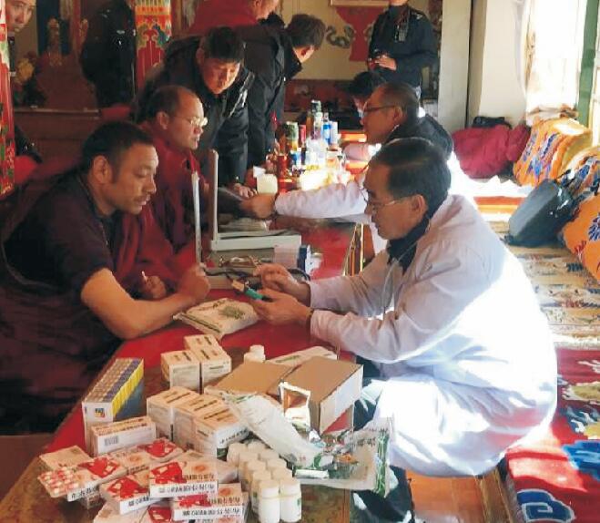 12月10日,在西藏阜康醫(yī)院名譽院長、慢病管理中心主任張德才的帶領下一行6人前往楚布寺,義診中張院長和田豐輝醫(yī)生負責測血壓,唐宗青測血糖,瓊瑪負責發(fā)放藥品,占堆對每一位血壓、血糖高的僧人、群眾進行登記,張院長根據(jù)西藏人民的生活健康狀況,對來義診人員提出《健康五大基石》。
